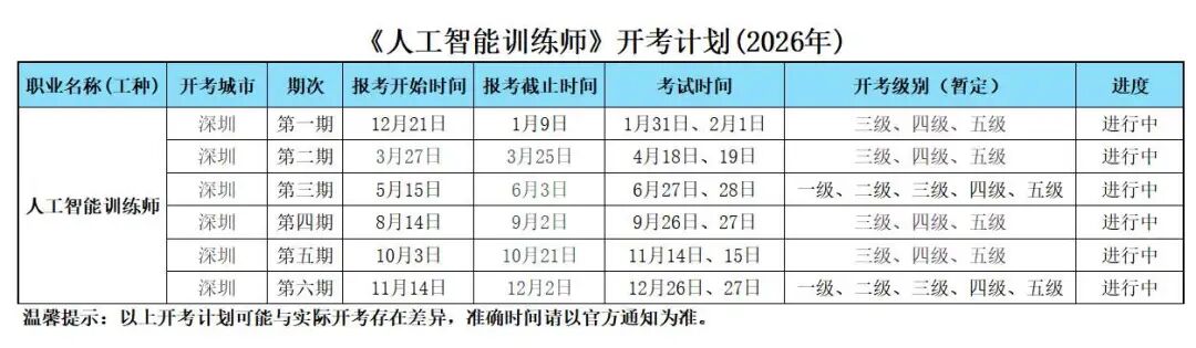 2026 年《人工智能训练师》职业技能等级考试深圳场次安排已出!覆盖全级别,备考的小伙伴快码住。