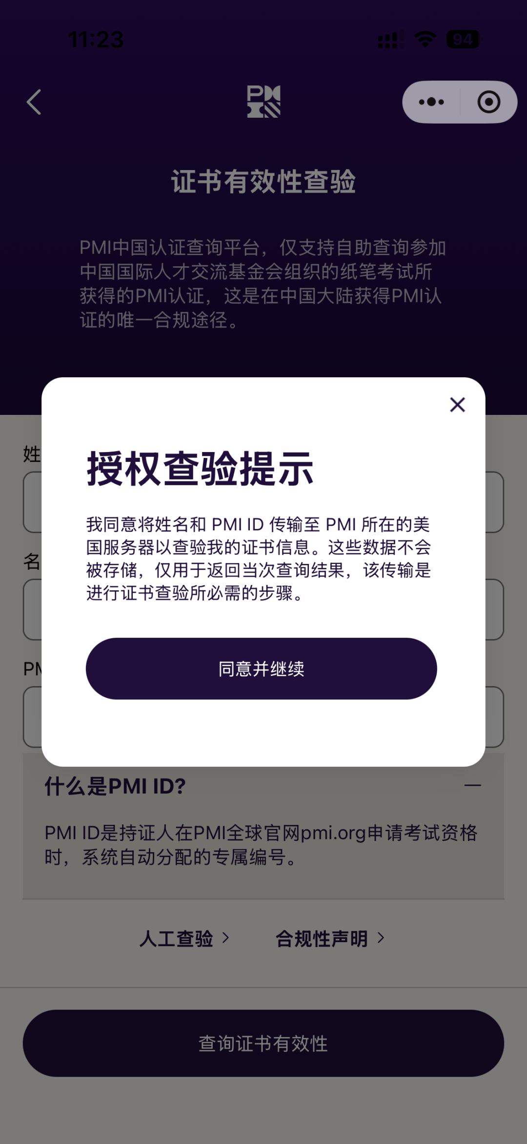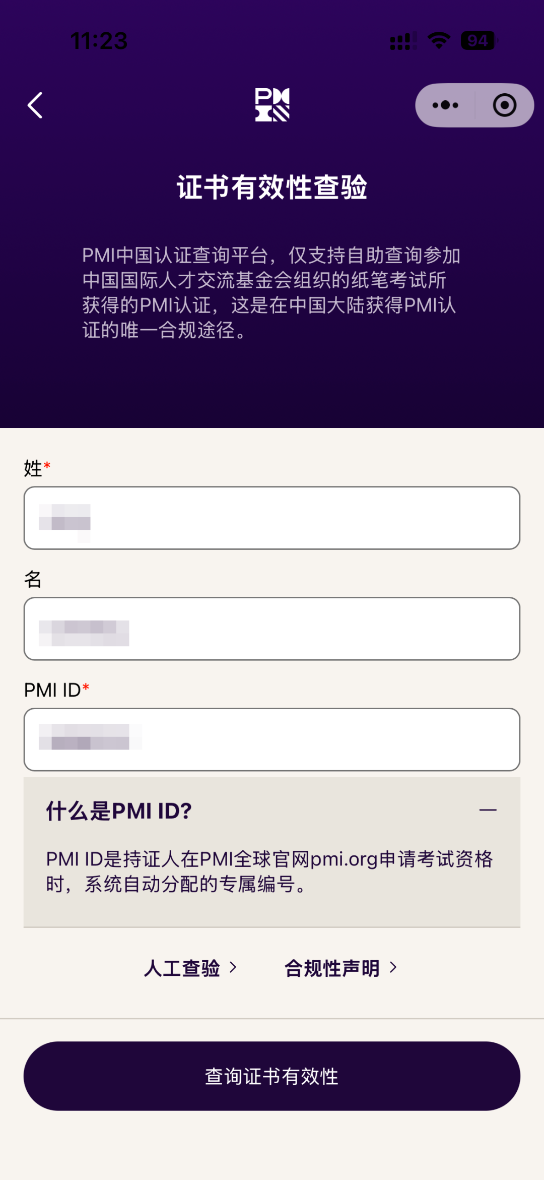 2. 在对应的输入框内填写自己的姓氏、名字以及PMI ID,姓氏和名字需要全拼音输入,确认填写无误后点击下方的“查验证书有效性”按钮。