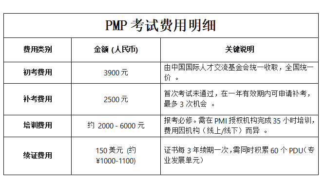 2026年中国大陆PMP®考试费用:初考3900元、补考2500元/次、续证150美元/3 年,以下是完整费用与规则说明。