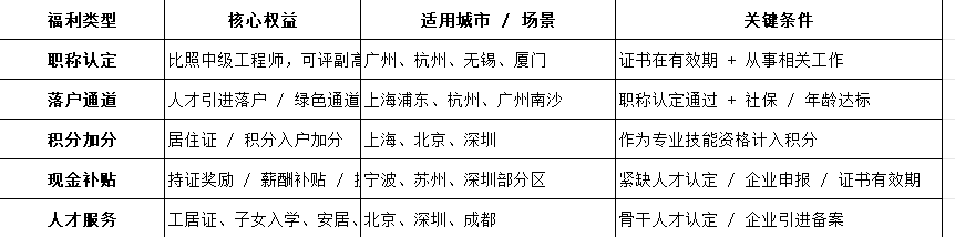 ●深圳:作为软件骨干人才评价依据,助力积分入户;部分区(南山、宝安)提供 1000-3000 元技能提升补贴。