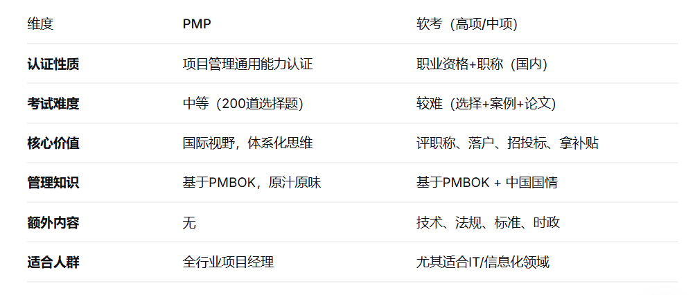 这是最核心的理由。软考高级(信息系统项目管理师)和中级(系统集成项目管理工程师)的管理部分,几乎是照搬了PMBOK的框架。