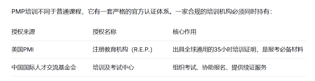 PMP®培训不同于普通课程,它有一套严格的官方认证体系。一家合规的培训机构必须同时持有: