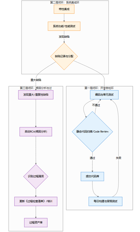 在改软件项目中,我设计并推行了一个“质量管理三层闭环”模型,它将质量保证活动融入日常,形成了一个持续反馈、持续改进的系统。