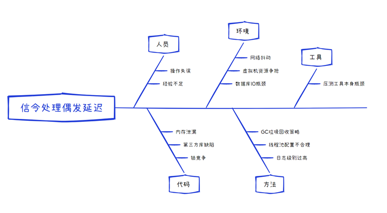 我将“信令处理偶发延迟”作为“鱼头”,然后引导团队从“人、机、料、法、环、测”(在软件领域常调整为:人员、环境、方法、代码、工具)五个维度进行头脑风暴。
