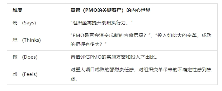 在考虑是否引入PMO时,高管客户的同理心地图,如下表所示:
