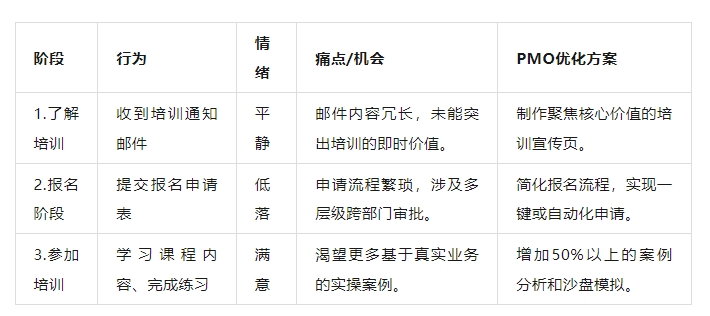 绘制新项目经理接受PMO培训的旅程图,如下表所示:
