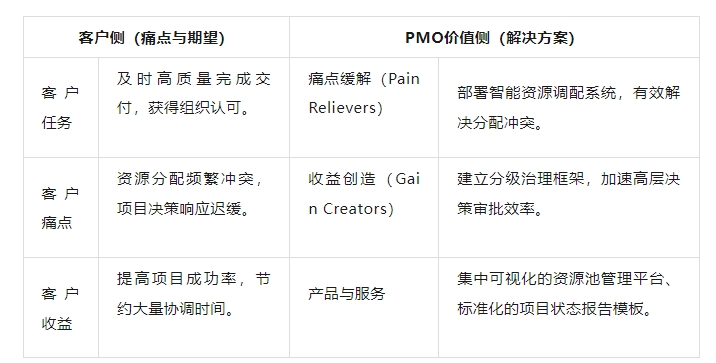 这是将前期所有客户洞察转化为具体服务方案的工具,它确保PMO的服务设计(右侧)能够精确地解决客户的核心痛点(左侧)。构建步骤如下: