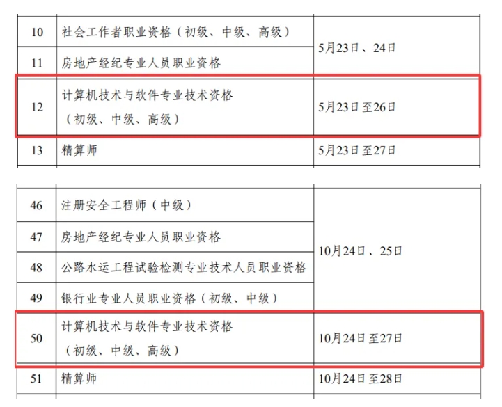 据人社部最新发布的《人力资源社会保障部办公厅关于2026年度专业技术人员职业资格考试工作计划及有关事项的通知》 ,2026年软考考试计划正式公布,2026年软考依然开考两次,上半年开考时间为5月23日至5月26日,下半年开考时间为10月24日至10月27日,上下半年各开考四天。