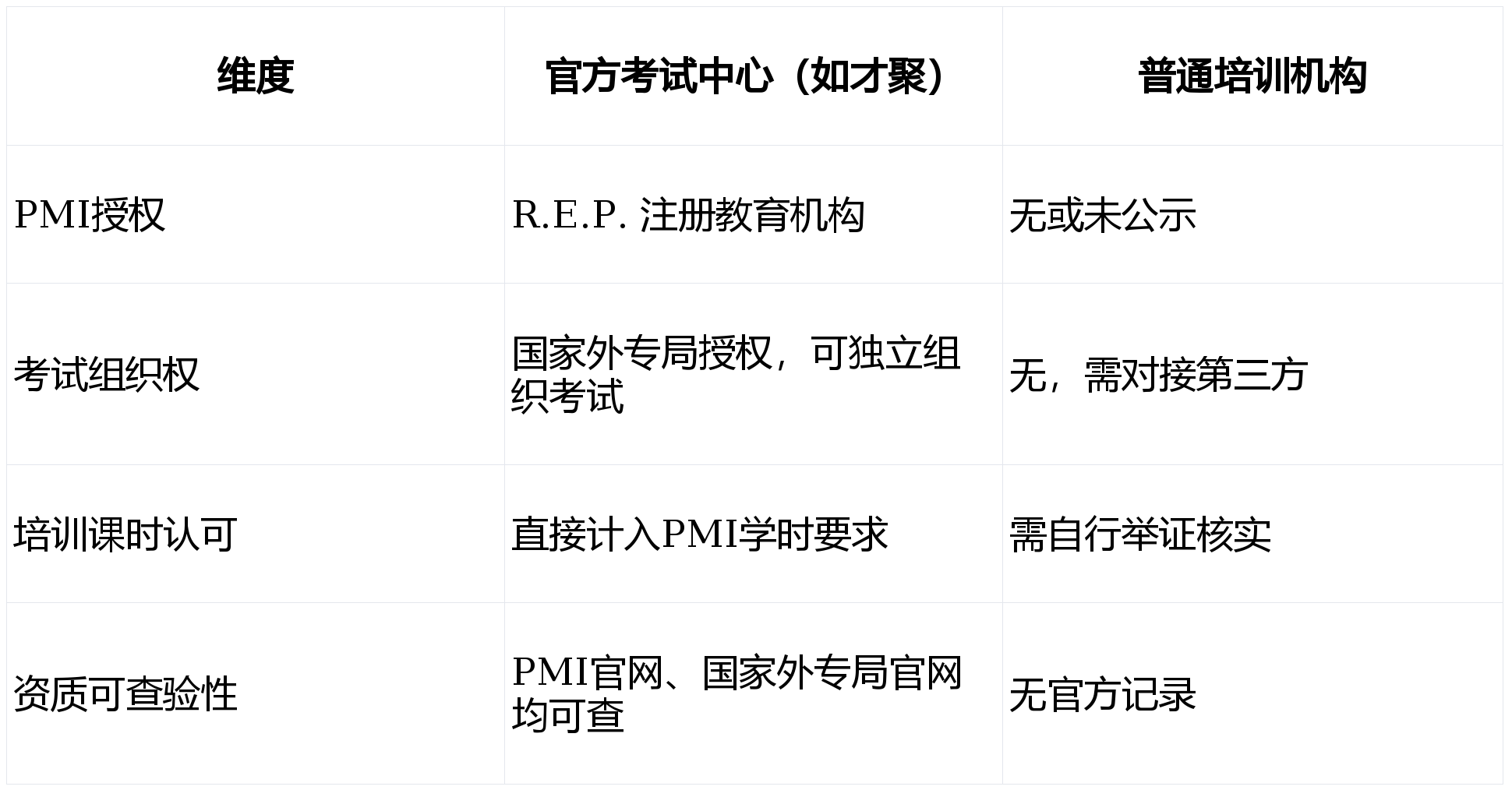 普通培训机构负责教,考试另找地方报;而官方授权考试中心是培训与考试一体,资质来自PMI和国家主管部门双重认证,考试组织权、题库对接、考场安排均在同一体系内完成。两者表面上都叫"PMP®培训",实质差距却贯穿备考全程。