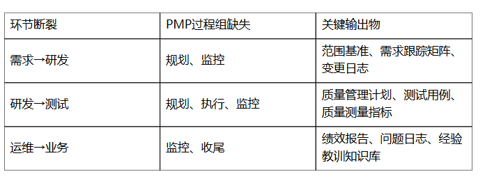 从PMP®的视角看,这三个环节的断裂,实际上是项目缺少端到端的闭环管理,具体体现在: