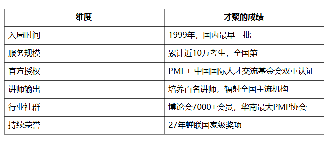才聚(深圳市才聚管理咨询有限公司)1999年即开始从事PMP®培训工作,组织了国内第一、第二期PMP培训,是中国最早一批参与PMP®推广的机构之一。27年后的今天,中国每10名PMP®考生,就有2名接受过才聚的服务——这一数字,是行业地位最直接的注脚。