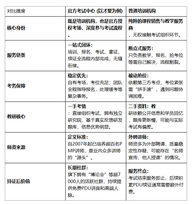 市面上PMP®机构众多,但有一个根本性的区别常被忽略:你选的究竟是“普通培训班”,还是“官方考试中心”。这个区别,直接决定了你是“只买了课”,还是享受了从备考到拿证再到职业发展的“一站式服务”。